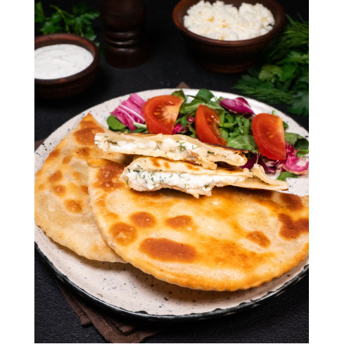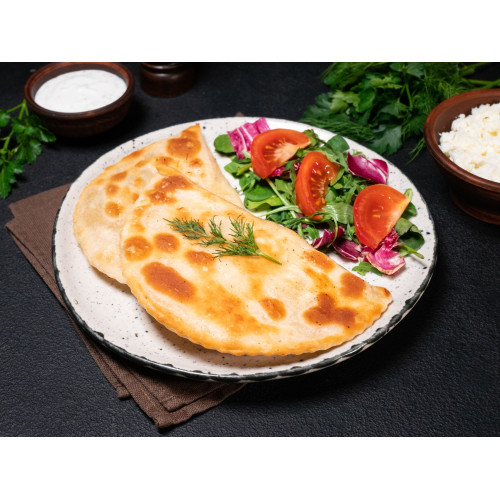 Cheese and Herbs Chebureki are thin, crispy fried pies filled with a rich, aromatic cheese-and-herb mixture. The dough is made from premium wheat flour, water, refined sunflower oil, vinegar, sugar and salt, which gives it elasticity and the perfect crunch after frying.