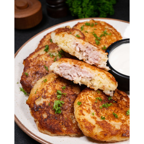 Meat Potato Fritters (Deruny) are hearty grated potato pancakes with a juicy meat filling inside each portion. The base is made from raw potatoes, bulb onion, chicken eggs, premium wheat flour and mayonnaise, giving the fritters a tender texture and a golden crust after frying.