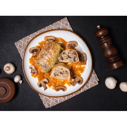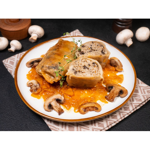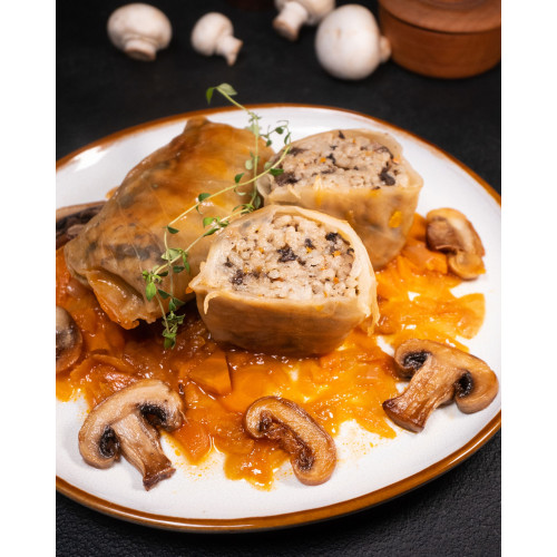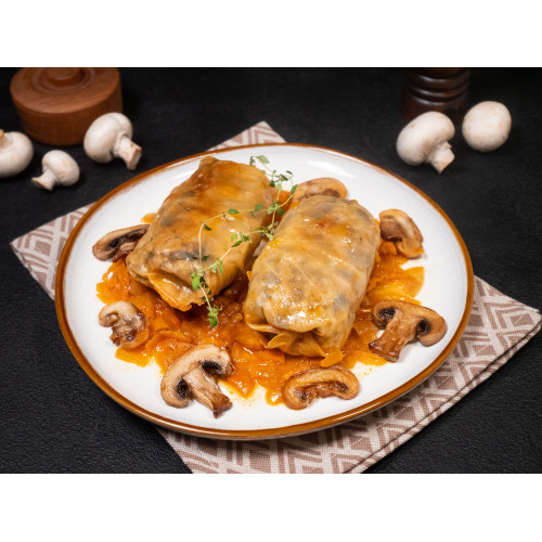 Delicate cabbage leaves are filled with a light yet flavorful blend of rice and sautéed mushrooms, combined with carrots and onions for natural sweetness. The result is a rich, comforting taste with a perfectly balanced, homemade feel.