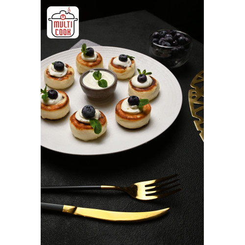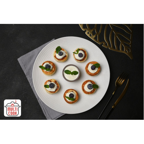 Syrnyky (cheese pancakes) are classic farmer cheese pancakes with a modern twist – tender inside. The base is sour milk cheese mixed with white granulated sugar, egg yolks, premium wheat flour, vanilla sugar and a pinch of salt, and then enriched for an extra dessert feel.